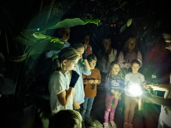 Es ist stockdunkel und sehr, sehr warm im Tropenhaus. Nur der Schein Eurer Taschenlampen erhellt das Dickicht des immergrünen Dschungels. So beginnt die spannende Reise durch die Welt der Tropen! Wie schmecken die Früchte des Urwalds, aus welchem Holz sind die großen Bäume, wie sieht Kakao, Maniok oder Baumwolle aus? Und wie hört es sich an, wenn sich alle puertoricanischen Pfeiffrösche auf einmal „unterhalten“? Es erwartet euch ein tolles Mitmachprogramm. Wenn Ihr Glück habt, entdeckt Ihr vielleicht sogar einen der kleinen braunen Coquís, die die ganze Nacht hindurch das Tropenhaus mit ihrem vielstimmigen und lauten Froschkonzert beschallen.
